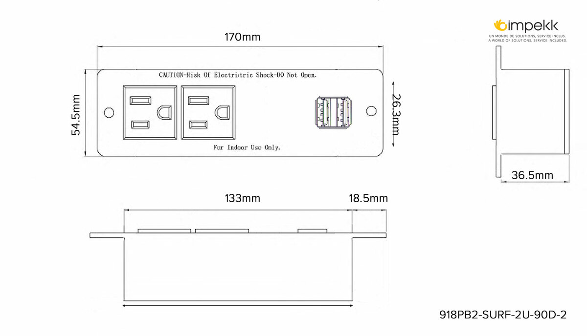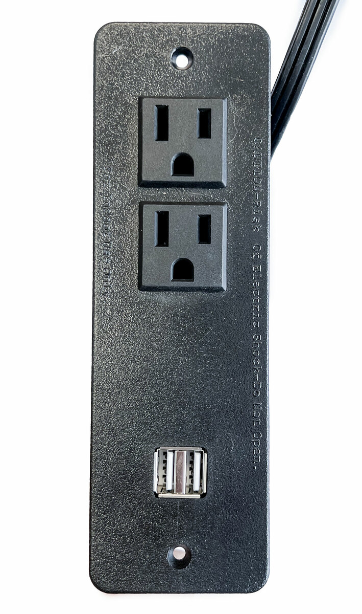 2 outlets (grounded). 2 USB outlets: Output 5V/650ma. 2 USB outlet 2,1A Total