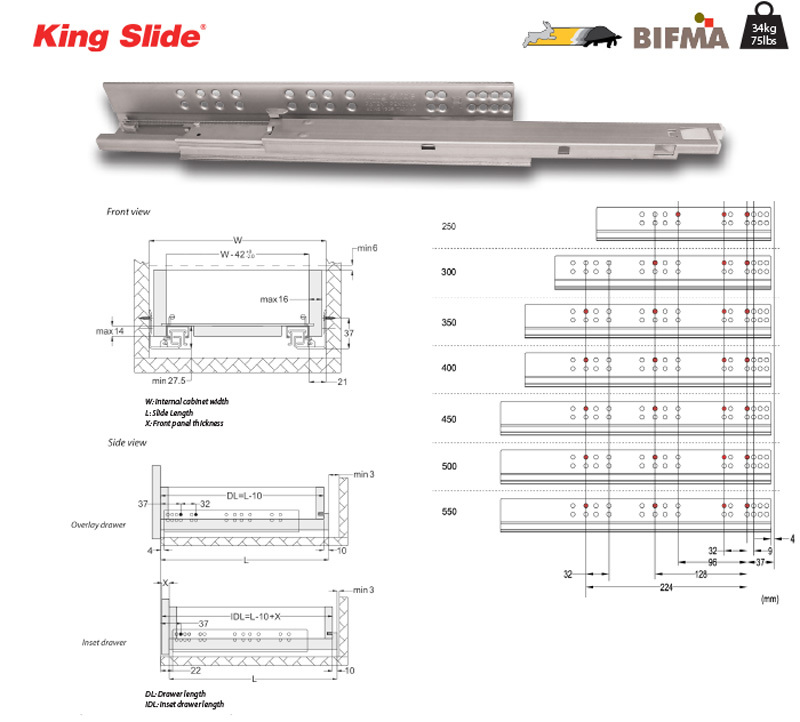 Coulisse à billes pleine extension avec amortisseur - Armoire sans cadre - B657XSC-XX