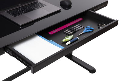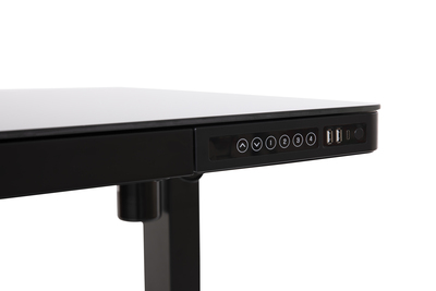 All-in-One stand up desk with gorgeous glass desk top & convenient built-in drawer. Includes one built in USB-C & 2 USB charging ports, equipped with a gyroscopic collision sensor and child Safety Lock. Boasts 4 programmable and customizable positions with advanced collision sensor sensitivity adjustments. You can also set your own min & max height or time-to-stand settings.