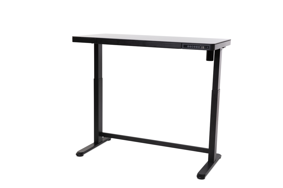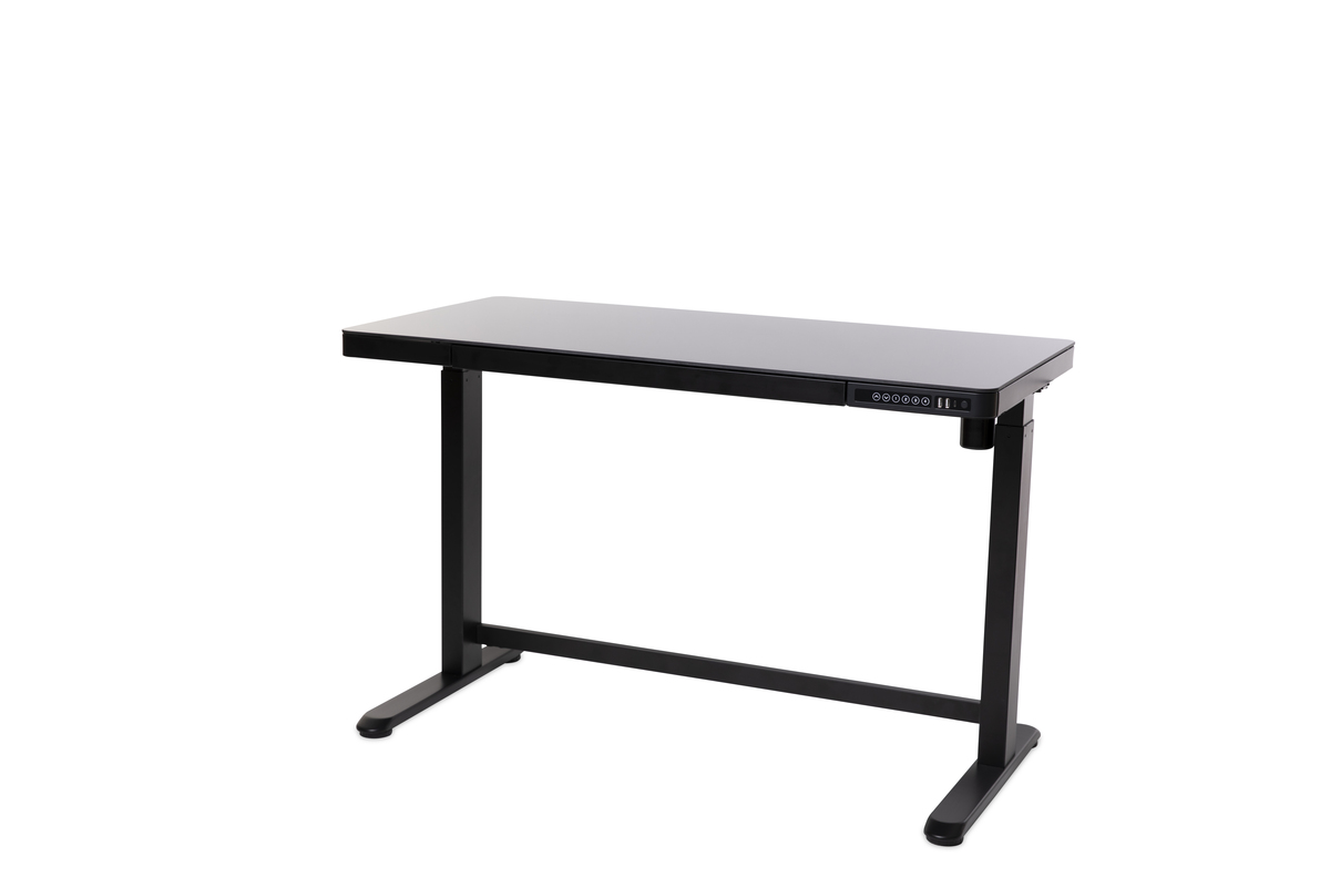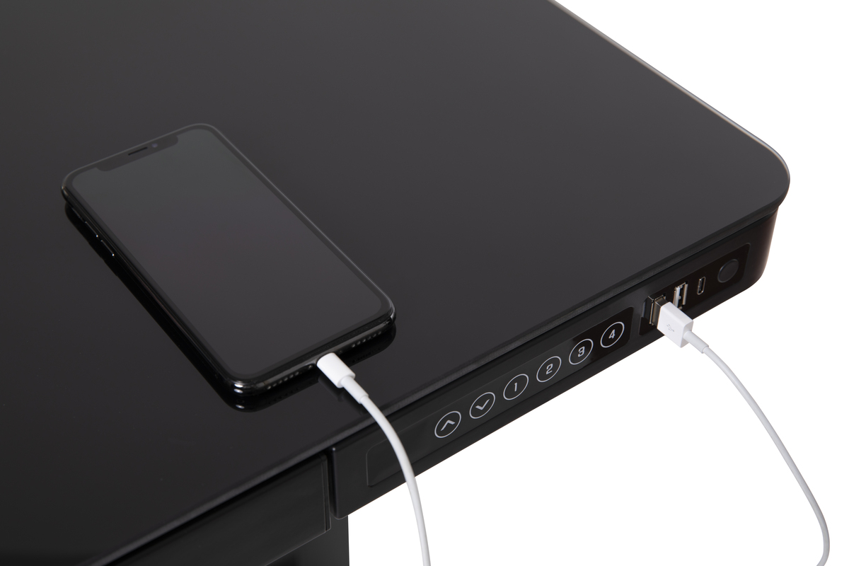 All-in-One stand up desk with gorgeous glass desk top & convenient built-in drawer. Includes one built in USB-C & 2 USB charging ports, equipped with a gyroscopic collision sensor and child Safety Lock. Boasts 4 programmable and customizable positions with advanced collision sensor sensitivity adjustments. You can also set your own min & max height or time-to-stand settings.